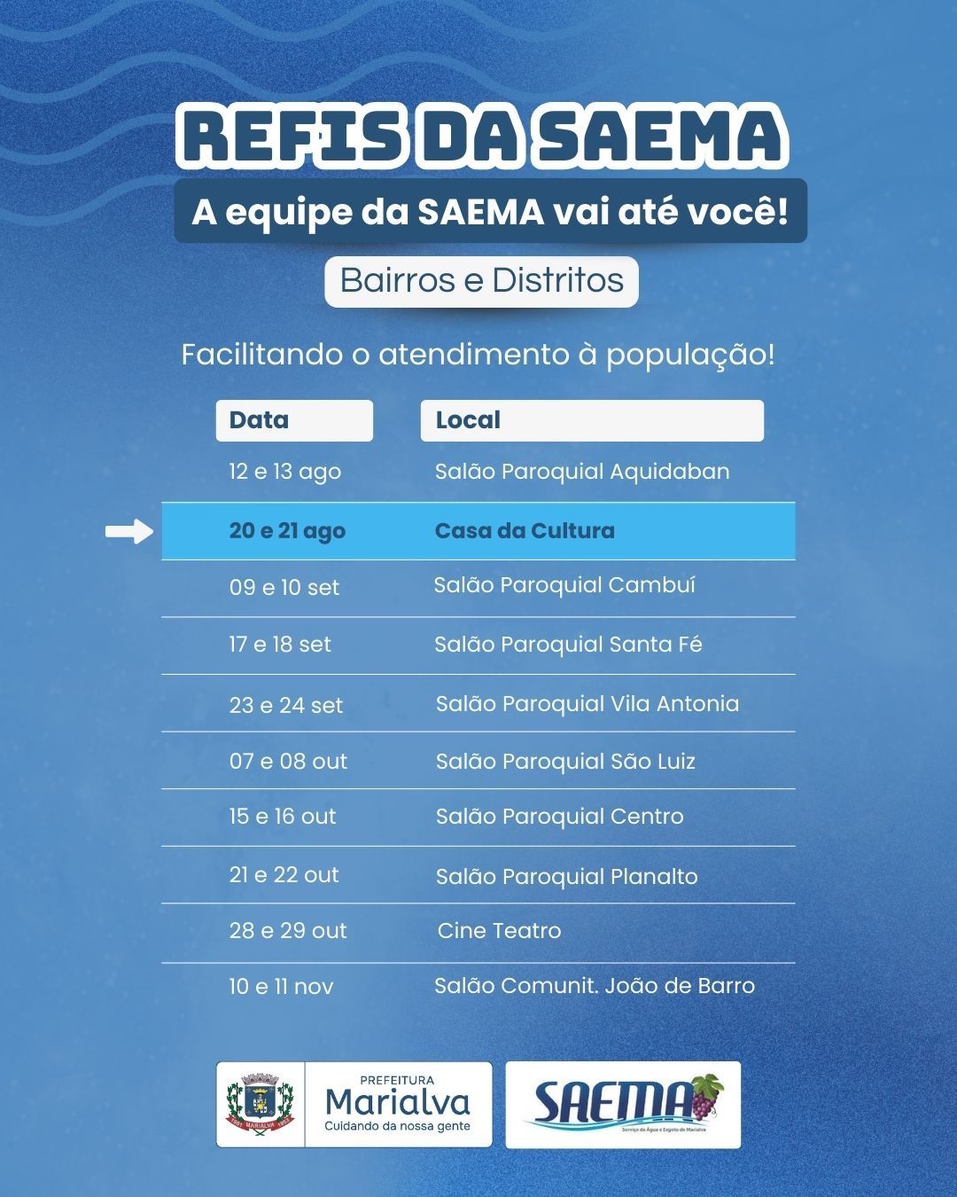 A novidade é que a Saema criou um cronograma de atendimentos itinerantes, para inscrever os interessados no programa! Você confere este cronograma na imagem anexa. Fique por dentro da programação, veja onde fica mais perto para você e aproveite para regularizar sua situação junto à Saema!